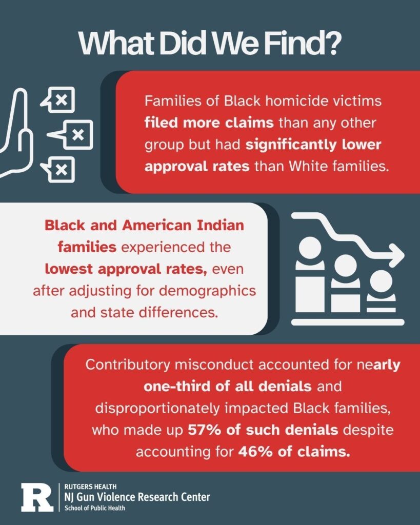 Working with Jeremy Levine, Tyshawn Sharpe, Kelsey Burke, and Brielle Savage, Semenza analyzed nearly 60,000 homicide victim compensation claims filed across 18 states between 2015 and 2023. Together, they found that families of Black homicide victims filed more claims than any other group but were significantly less likely to have them approved compared with White families. Even after controlling for gender, state, and application year, the disparity remained. The most pronounced gap appeared in denials tied to “contributory misconduct”—a broad, discretionary determination often made by law enforcement about whether a victim’s behavior may have contributed to their death. Nearly one-third of all denials fell into this category, and families of Black victims made up 57 percent of them despite accounting for 46 percent of all claims.